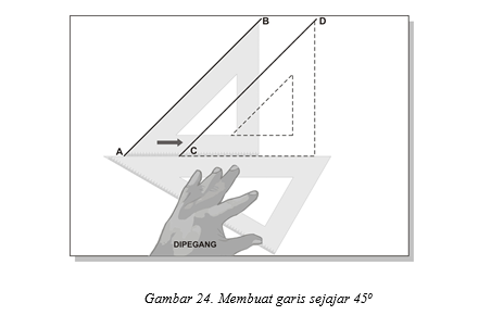 • Selanjutnya geser segitiga 45o/45o sesuai dengan jarak yang dikehendaki kemudian tarik garis CD maka garis CD akan sejajar dengan garis AB.